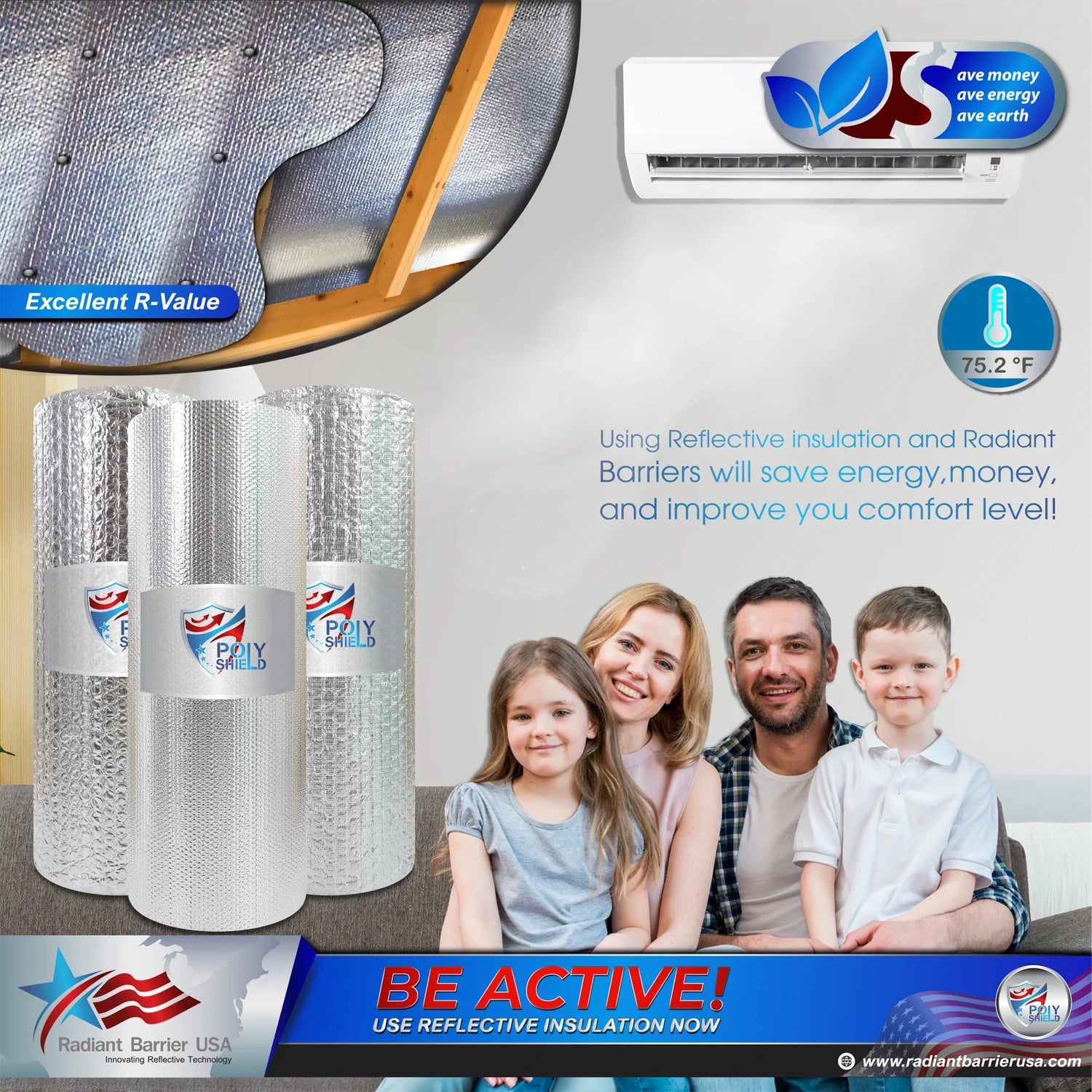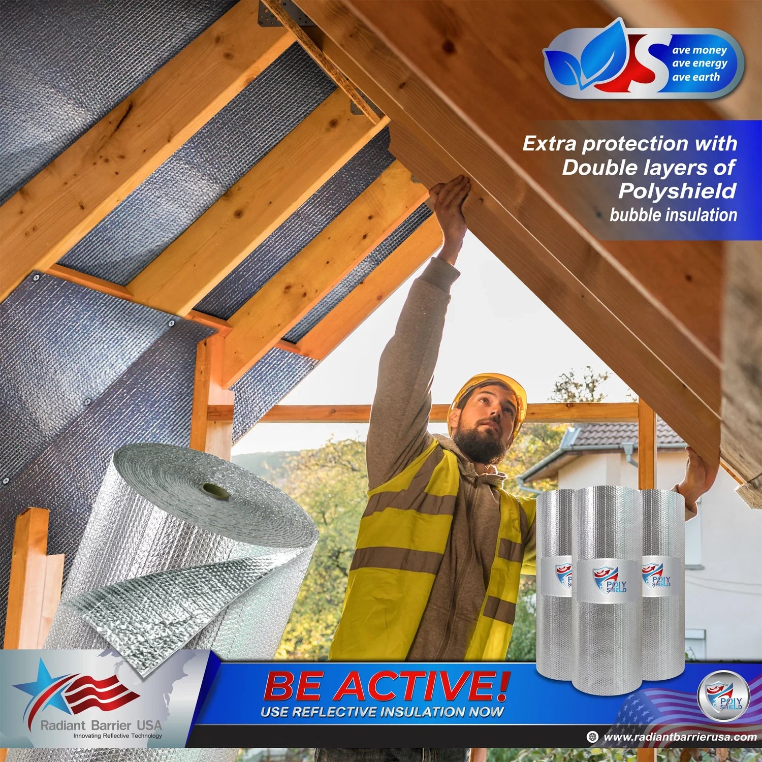 Polyshield Bubble Foil/Foil, a thicker and stiffer alternative to its radiant barrier counterparts, offers an easier installation process and helps prevent sagging. In comparison to radiant barriers, it provides a superior thermal break, reducing conductive heat transfer (gain or loss) in buildings. With the same 95% reflectivity as other variations, the foil/foil version enhances the finished ceiling's appearance, offering a superior silver shiny look.