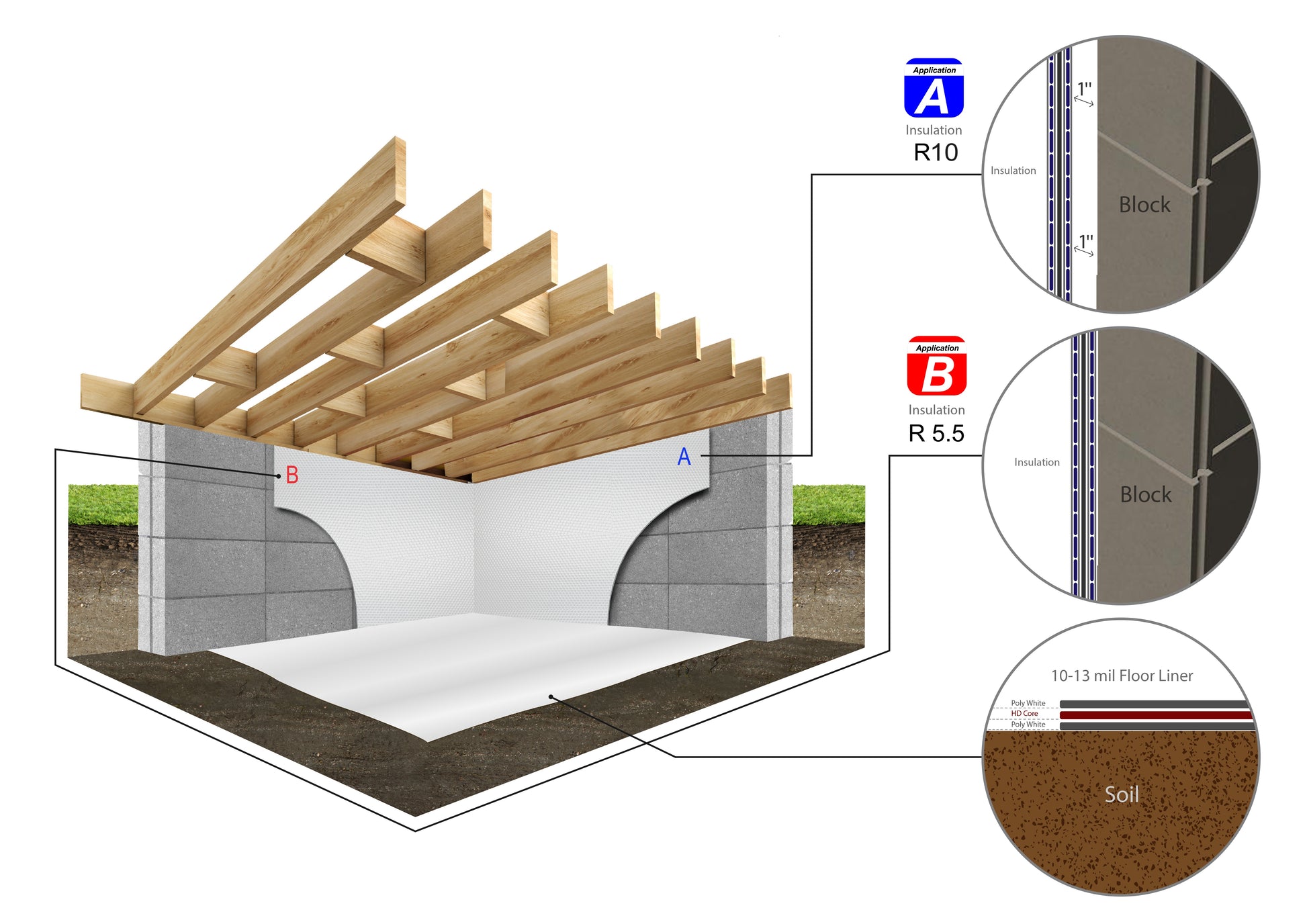 Some states require a specific R-Value when insulating crawlspace masonry walls, while many states and municipalities don’t require a specific R-Value. Triplex Crawlspace Insulation provides a minimum R10 value when including a 1″ air space on the inside surface of masonry walls. Triplex Crawlspace Insulation is a superior vapor and moisture barrier as well!